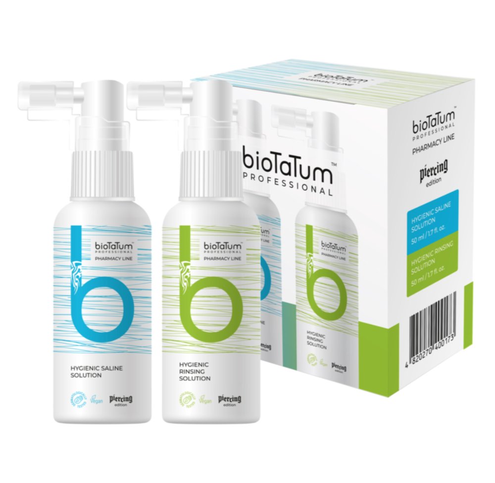 | Nazwa: | Zestaw rozwiązań do pielęgnacji piercingu BioTaTum Hygienic Saline Solution, 2 х 50 ml |
