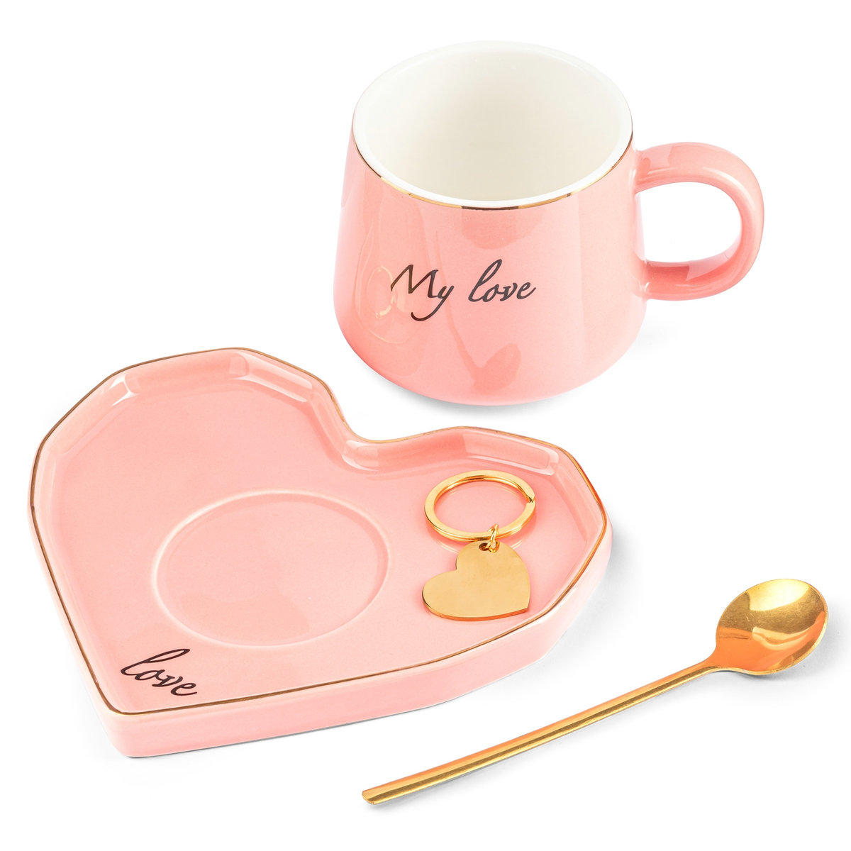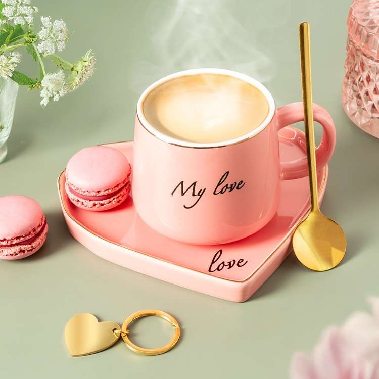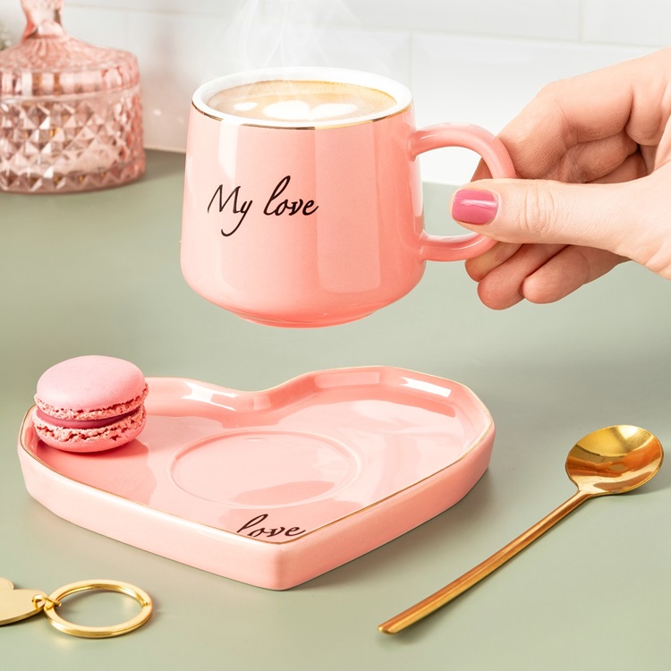 W zestawie znajdziesz porcelanową filiżankę z różowym połyskiem, serduszkowy spodek i złotą łyżeczkę, które wspólnie tworzą zestaw idealny do celebrowania poranków. Całość uzupełnia brelok w kształcie serca z możliwością wygrawerowania – osobisty akcent, który zostanie na długo. A wszystko to zamknięte w stylowym, różowym pudełku, gotowym do wręczenia.