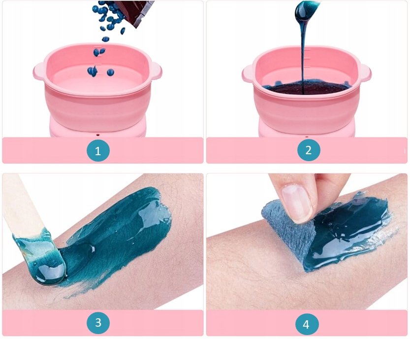 3. Po upłynnieniu wosku, przed aplikacją na skórę zawsze sprawdź temperaturę wosku na nakładając małą ilośc na nadgarstek , aby uniknąć poparzeń.