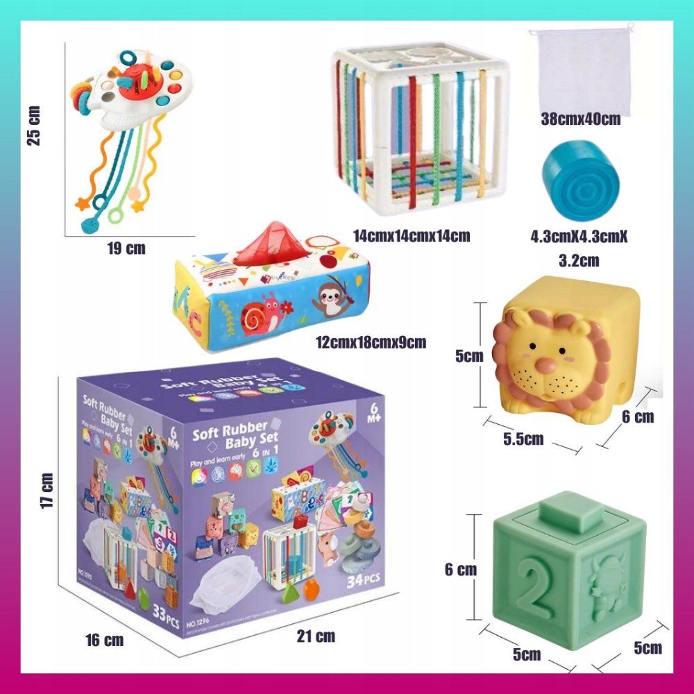 Zestaw Box 6w1 to kompletny pakiet edukacyjnych i sensorycznych zabawek, które zapewnią maluchowi niekończące się godziny radosnej i rozwijającej zabawy.