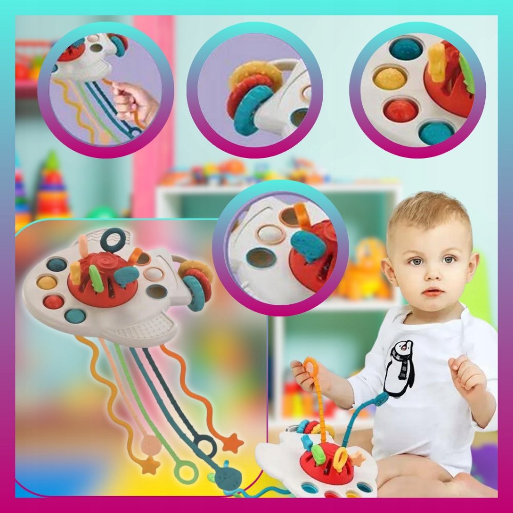 Kolorowe sznurki do przeciągania: Na górze zabawki znajdują się różnorodne, kolorowe sznurki o różnych teksturach, które dziecko może przeciągać. To doskonałe ćwiczenie dla rozwijania zdolności manualnych oraz koordynacji ruchowej maluszka.