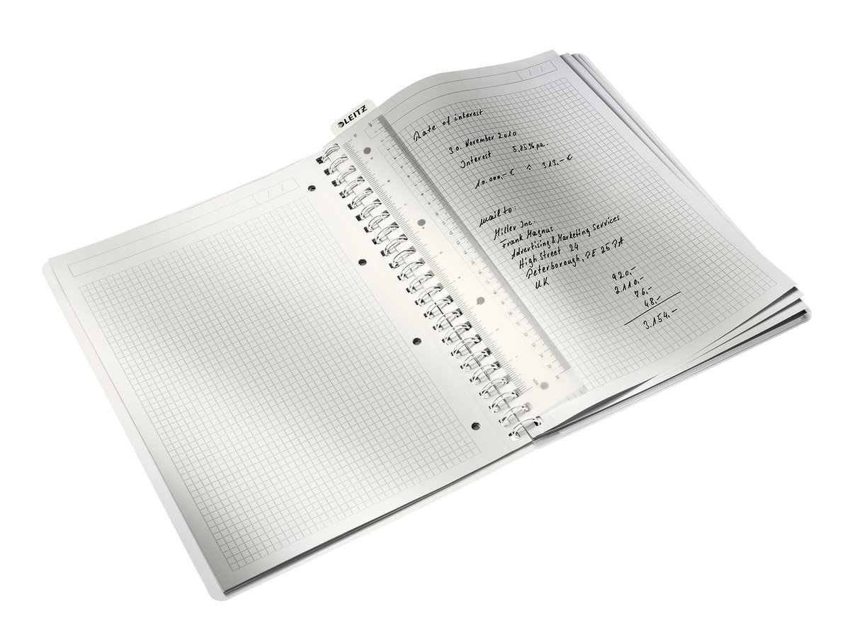 kołonotatnik A5 80 kartek idealnie pasuje do domowego biura element kolekcji Leitz WOW perforowane kartki umożliwiające wpięcie do segregatora linijka służąca także jako zakładka na tylnej okładce,