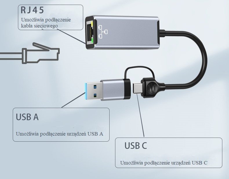 - Złącza: USB-A / USB-C (męskie), Ethernet (żeńskie)