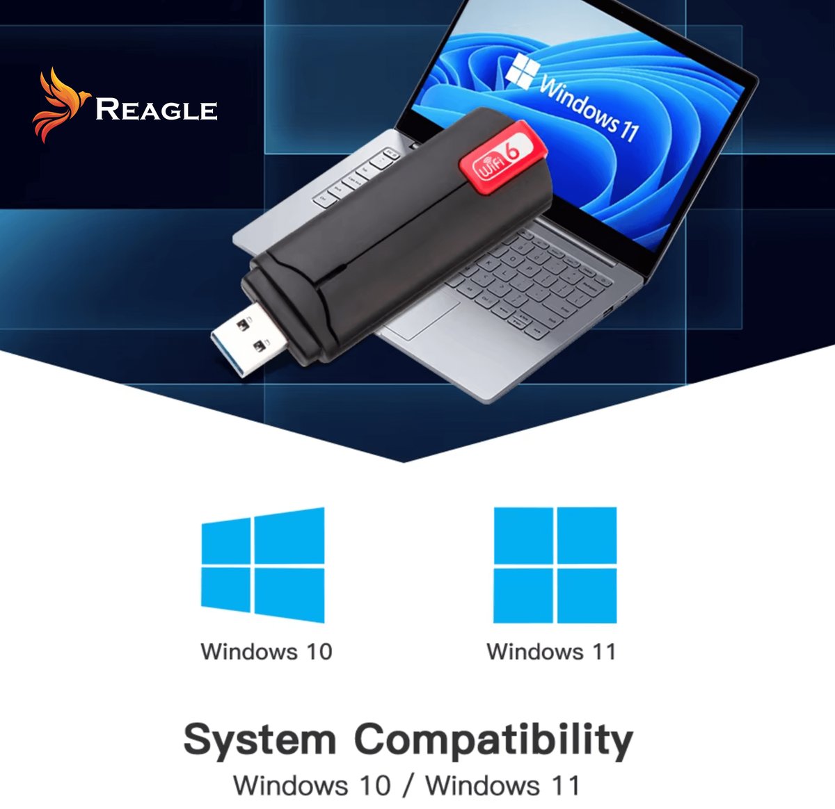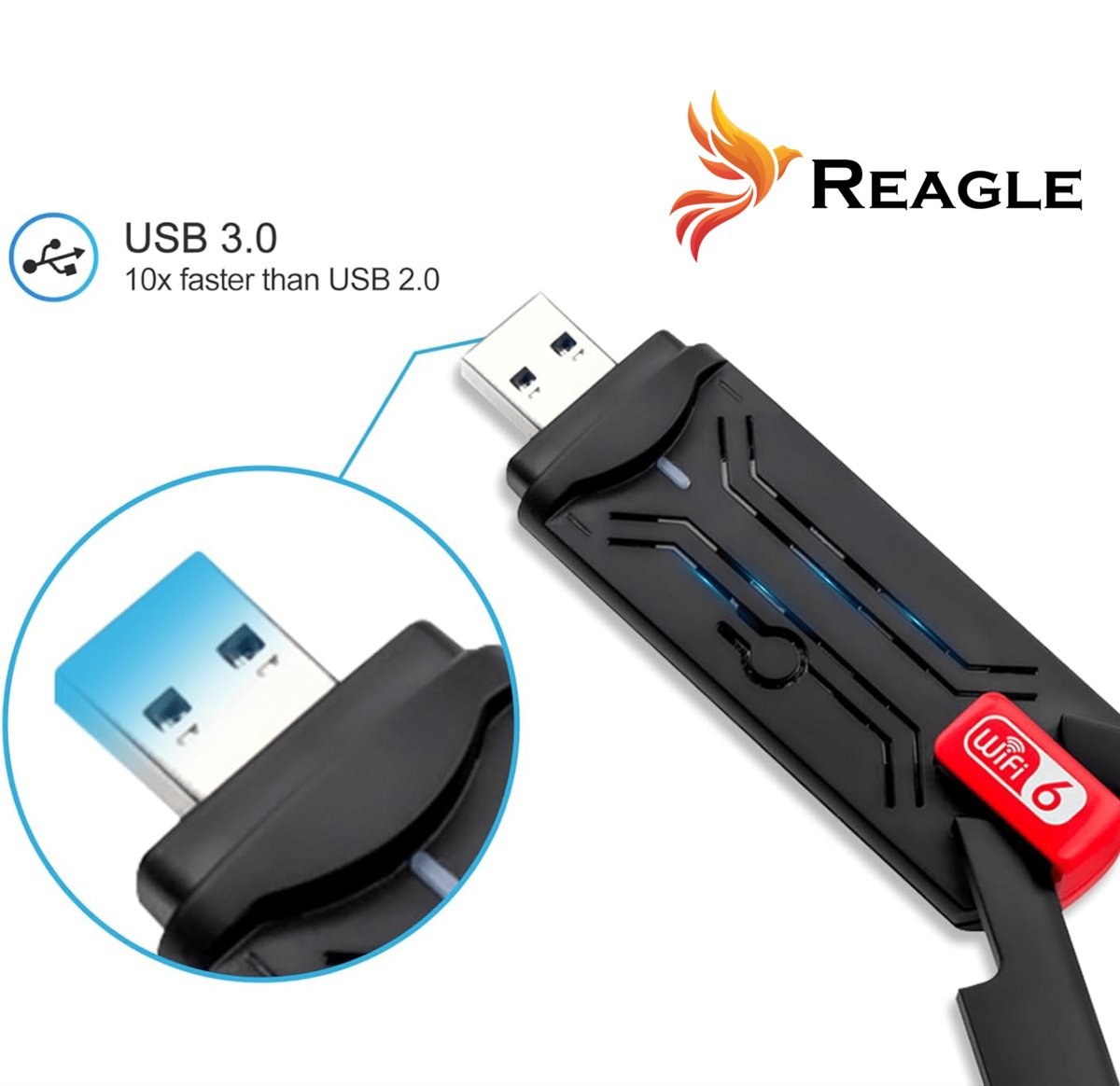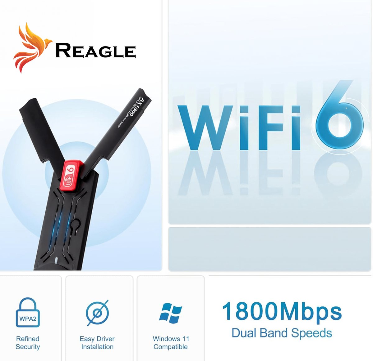 Reagle RYWU5 to zewnętrzny adapter Wi-Fi z wtykiem USB-A. Najważniejsze cechy: Wtyk USB-A zapewnia kompatybilność z szeroką gamą urządzeń oraz systemami Windows 7,8 10 i 11 Standard 802.11ax Wi-Fi 6