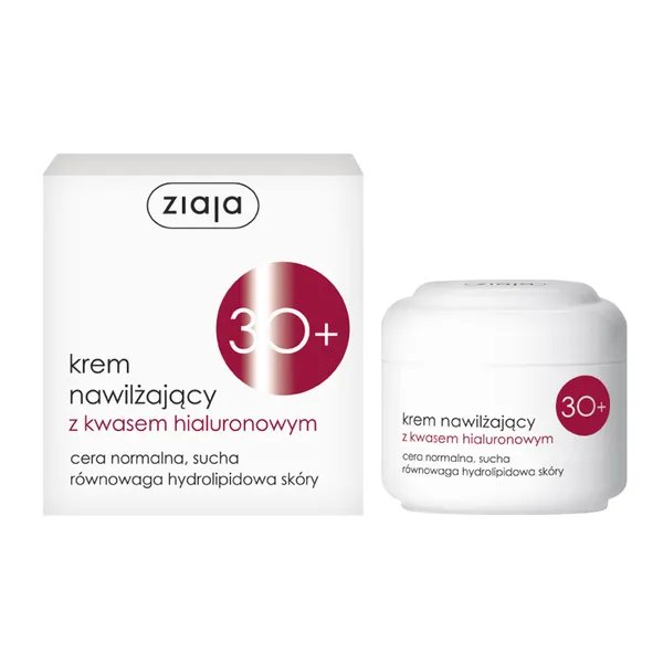 Ziaja 30+, krem nawilżający, z kwasem hialuronowym - wygładza zmarszczki, wiąże wodę, łagodzi i wspomaga regenerację, pojemność 50 ml.