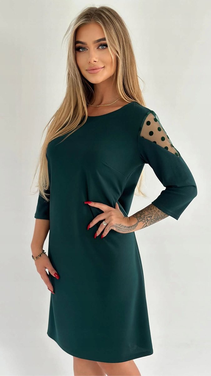 - Sukienka posiada okrągły dekolt oraz 3/4, ozdobne rękawki ze wstawką z siateczki w urocze zamszowe groszki, dzięki czemu przełamują klasyczny fason oraz dodają szyku i elegancji.