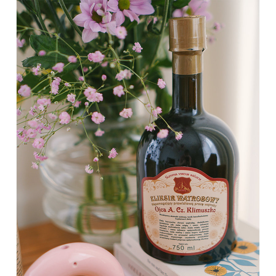 Eliksir wątrobowy wspiera funkcje wątroby (karczoch, mięta, jałowiec), optymalizuje trawienie (mięta, melisa, koper włoski) i wydzielanie żółci (mięta, jałowiec, chmiel) oraz wspiera usuwanie produktów przemiany materii z organizmu (chmiel, pokrzywa).