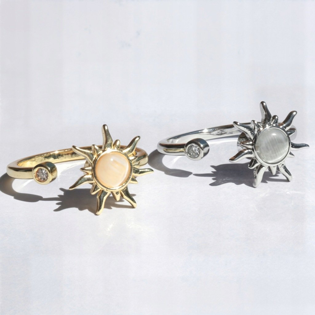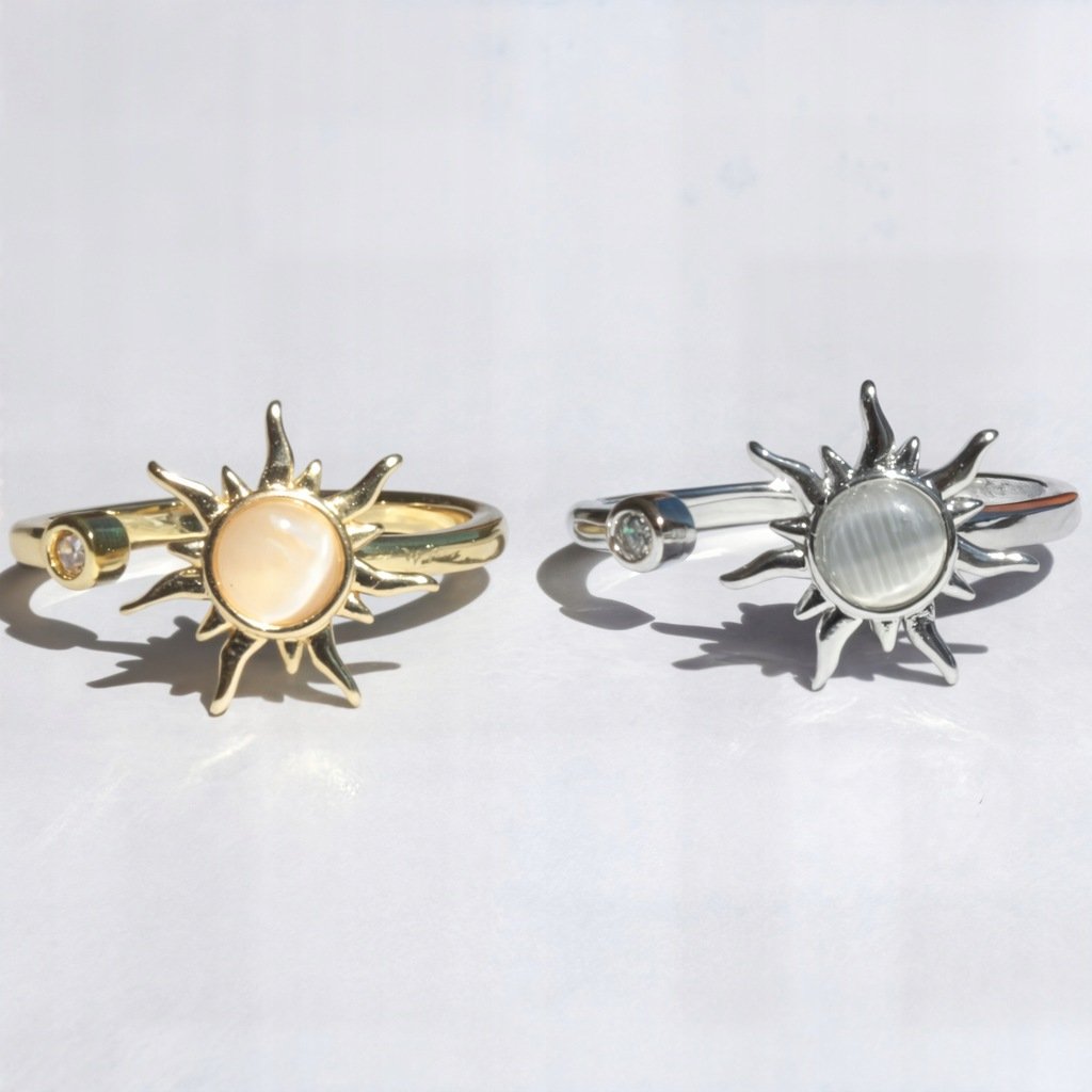 Centralny element w formie słońca z ciepłym, perłowym środkiem płynnie się obraca, działając jak kojący fidget ring. Idealny, by zająć dłonie i znaleźć chwilę relaksu. To praktyczna biżuteria antystresowa dla każdej kobiety ceniącej elegancję.
