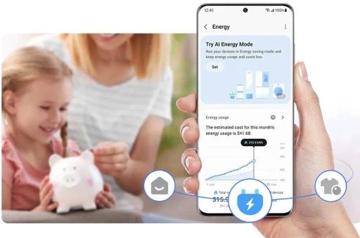 *Aplikacja SmartThings dostępna na urządzeniach z systemem operacyjnym Android i iOS (Android OS 8↑, iOS 13↑). Wymagane połączenie z siecią Wi-Fi i konto Samsung. Wszystkie zarządzane urządzenia muszą być zarejestrowane w aplikacji SmartThings. **Na podstawie wewnętrznych testów porównujących temperaturę wody w standardowym trybie zgodnym z ustawieniami fabrycznymi w trybie garnki i patelnie do temperatury po włączeniu AI Energy mode. Wyniki zależą od aktualnych warunków wykorzystania. AI Energy mode może być używany z 6 cyklami: intensywnym, ekspresowym, extra cichym, garnki i patelnie, plastik i auto.