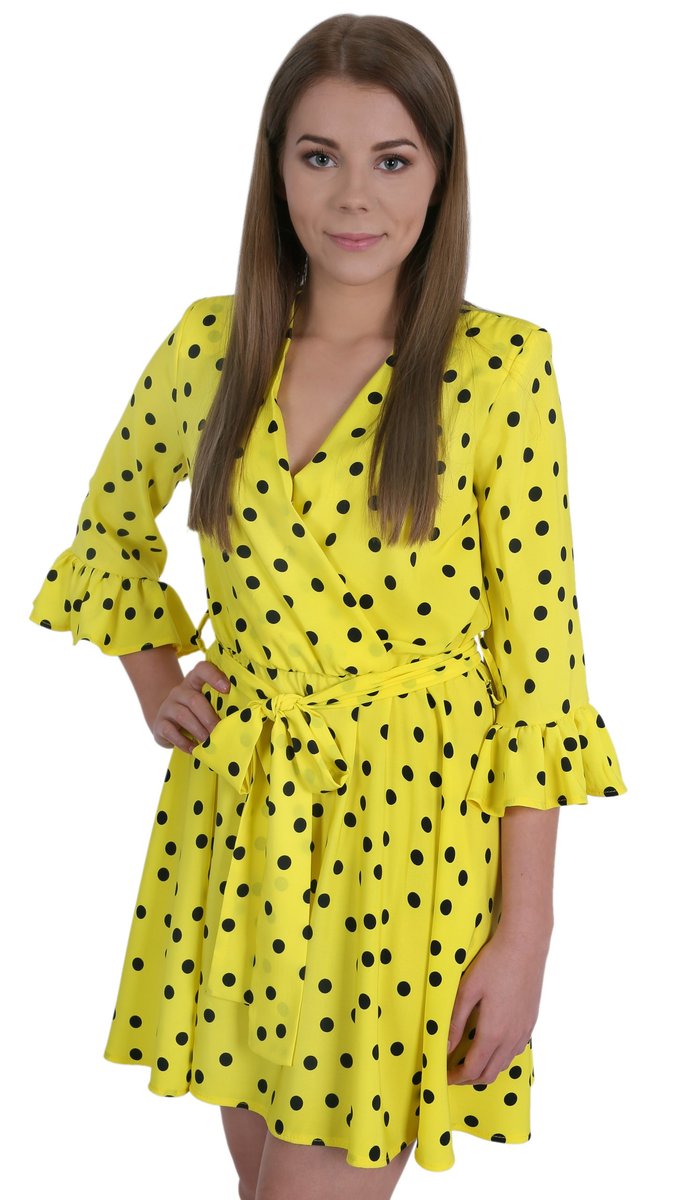 Piękna, żółta sukienka mini w czarne groszki.