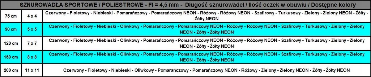 JEDNAKOWA CENA DLA WSZYSTKICH PRODUKOWANYCH KOLORÓW ORAZ DŁUGOŚCI Z TEGO RODZAJU SZNUROWADEŁ, KTÓRE OPISUJE TABELA WIDOCZNA W GALERII OFERTY.