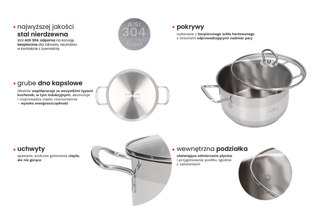 Zastosowane odpowiednio grube ścianki długo utrzymują ciepło, a specjalnie wzmocniony rant zapewnia wytrzymałość i odporność na odkształcenia. Każdy garnek posiada odpowiednio dopasowane i wyprofilowane pokrywy z bezpiecznego szkła hartowanego z otworami odprowadzającymi nadmiar pary. We wnętrzu garnków zastosowano podziałkę litrażową ułatwiającą odmierzanie płynów i przygotowanie potrawy zgodnie z założeniami.